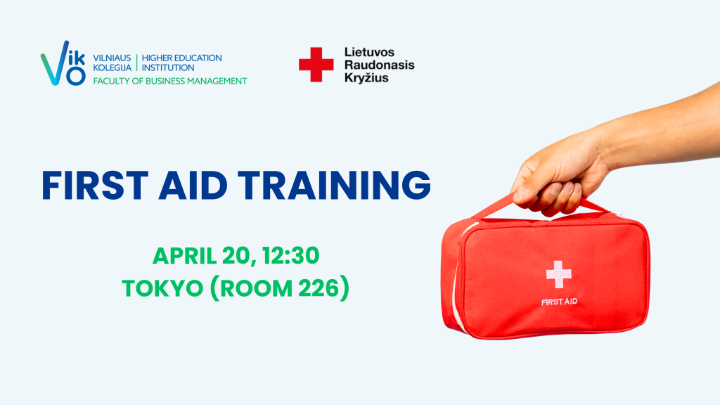 You are warmly invited to join our free educational session, “First Aid Training”, led by the Red Cross, which will take place at 12:30 on 20 April 2026 in Room 226 (Tokyo) at Vilniaus kolegija, Faculty of Business Management (Didlaukio st. 49, Vilnius).
